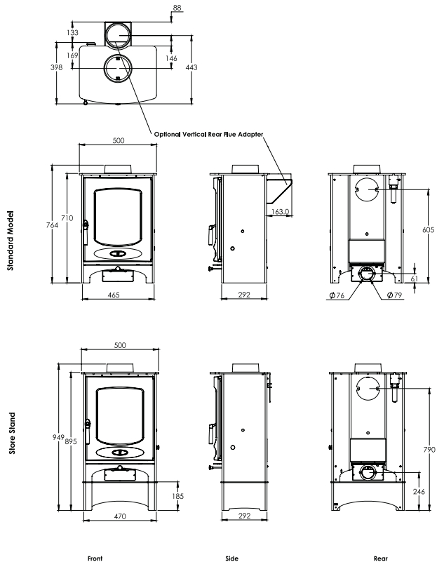 | Flue connection | 150mm - top or rear interchangable |