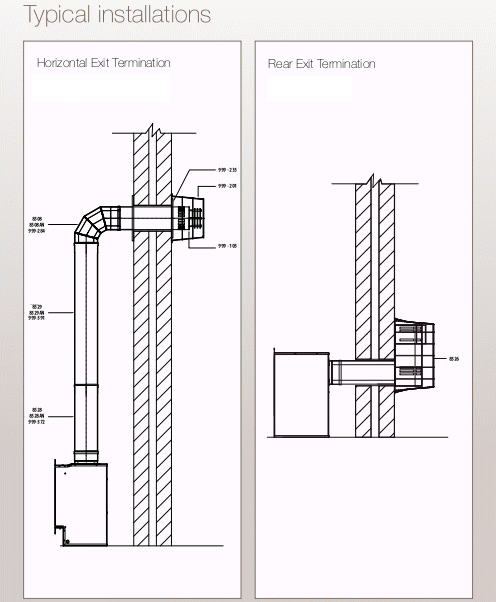 Depending on the stove or fire selected, the twin-walled pipe may exit horizontally through an external wall or vertically through the roof.