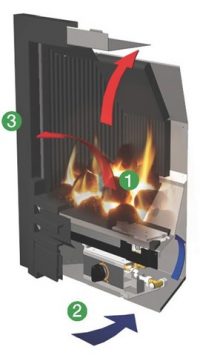 The hotbox draws cool room air into the bottom of the appliance (2) and then emits radiant heat into the room (3) via the glow generated on the ceramic fuel bed. This provides convenient and comforting warmth whilst retaining all the ambience of a real open fire.