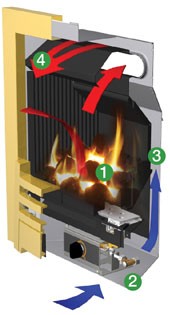 The convector box draws cool room air into the bottom of the convection chamber (2) the cool air is warmed as it passes over the hot surfaces of the chamber (3) and the hot air is then emitted back into the room via the top convection slot (4).