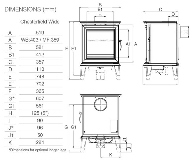 | Flue connection | 125mm - top or rear interchangable |
